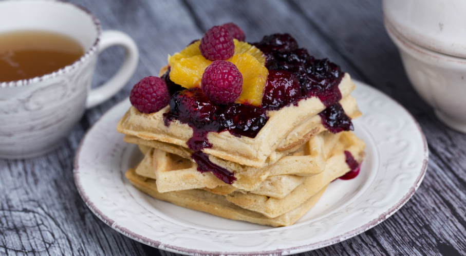A száraz hozzávalókat keverőtálba tesszük. A kókusztejet elkeverjük a tojássárgájával. A tojásfehérjéből nem túl kemény habot verünk. A kókusztejes keveréket összekeverjük a száraz alapanyagokkal vigyázva, hogy ne keverjük túl. Egy saptulával lazán hozzáforgatjuk a fehérje habot. Ízlés szerint kerülhet a masszába vanília kivonat vagy pirított szezámmag is – akár a kettő együtt is. Felmelegítjük a gofri sütőt és kisütjük a gofrikat. Ha előre sütjük a gofrikat készítsük őket világosabbra és melegítsük fel kenyérpirítóban. A málnából a cukorral, gyömbérrel, vérnarancs levével és a pálinkával szirupot főzünk és ezzel tálaljuk a gofrit.