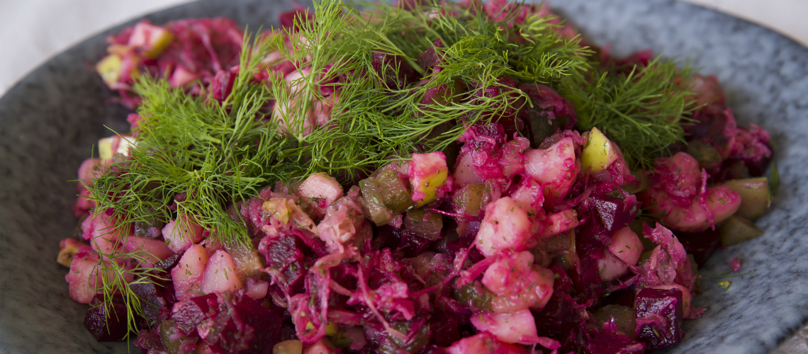 A céklát megsütjük: 200C fokra előmelegítjük a sütőt, a céklákat héjastul, egyesével alufóliába csomagoljuk, majd kb. 1 óra alatt megsütjük. A pontos sütési idő a cékla méretétől függően változhat (1-1,5 óra között). Amikor megsült, lehűtjük annyira, hogy kézzel hozzá tudjunk nyúlni, meghámozzuk, majd kb. 1 cm-es kockákra vágjuk. A céklát akár 2-3 nappal előre is meg lehet sütni, alufóliába csomagolva eláll a hűtőben. A burgonyát meghámozzuk, a céklával azonos méretűre kockázzuk, majd sós vízben megfőzzük és leszűrjük. Az uborkát és az almát (vagy ropogós, lédús nasi körtét) szintén felkockázzuk. Az összes zöldséget óvatosan összeforgatjuk, majd hozzáadjuk a savanyúkáposztát, érdemes azt is kissé felvágni, hogy kényelmesebben legyen fogyasztható. Sózzuk, borsozzuk, beletesszük a finomra aprított kaprot, végül összekeverjük a napraforgó olajjal. Érdemes néhány órára behűteni, hogy összeérjenek az ízek.