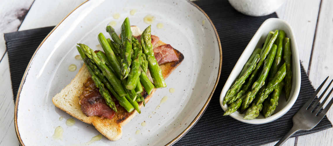 Tisztítsuk meg a spárgát, dobjuk forrásban lévő vízbe 1-2 percre. A sonkát serpenyőben mézzel megpirítjuk. A kenyeret vajon sütjük, a végén megszórjuk fűszerekkel. A spárgát serpenyőben vajon megpirítjuk, a pirítóson tálaljuk.