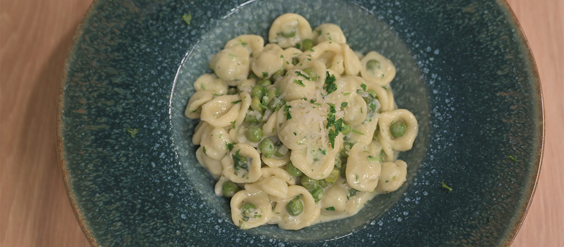 Egy nagy serpenyőben melegítsd fel az olívaolajat és a vajat. Add hozzá a finomra vágott hagymát, párold lágyra, áttetszőre 3–4 perc alatt. Add hozzá a fokhagymát, párold további 1 percig, ügyelve, hogy ne égjen meg. Tedd bele a zöldborsót, sózd, borsozd, és párold 5–6 percig, míg a borsó puha, de még enyhén ropogós marad. A párolt borsóhoz add hozzá a vajat, citrom reszelt héját és kevés citromlevet. Keverd össze, majd vedd le a serpenyőt a tűzről. Add hozzá a ricottát, és dolgozd bele, amíg krémes lesz a szósz, szórd meg aprított petrezselyemmel.