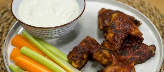 Ragacsos csirkeszárnyak, zöldségcsíkok kéksajtos mártogatóssal