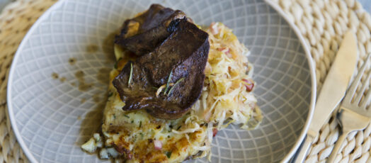 Sült sertésmáj káposztával, szalonnával és hasábburgonyával