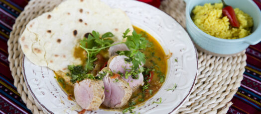 Sertésszűz masala kókusztejjel, fűszerekkel és fokhagymás naan kenyérrel