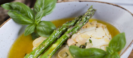 Ázsiai saláta spárgából, dinnyéből és grillezett pak choyból