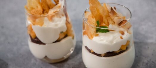 Kókusz mousse piskótával, marinált sárgadinnyével