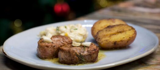 Pirított sertés szűz langyos káposztás-kukoricás salátával, pirított burgonyával