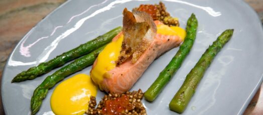 Bőrén sült lazac, fehérboros hollandi mártással, spárgával, lazacbőr ropogóssal
