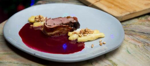 Vaddisznó szűz, mentás málnaszósszal, parmezános burgonya nudlival, pirított fenyőmaggal