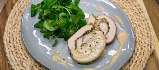 Zöldfűszer pesztóval és prosciuttóval töltött pulykatekercs gesztenyés mártással