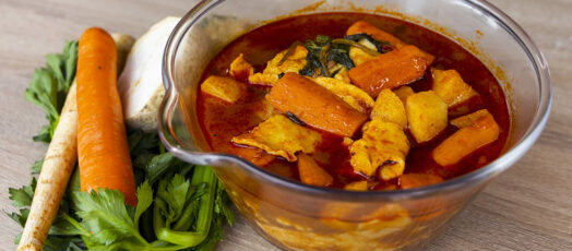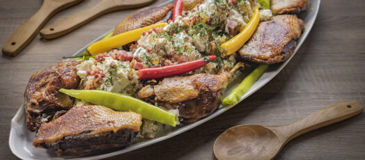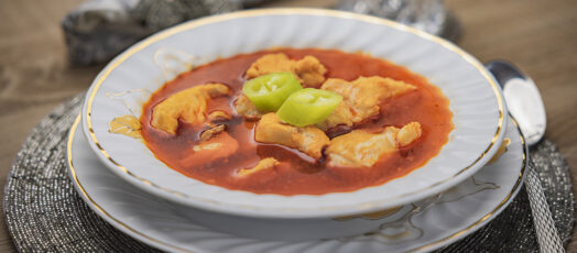 Lármás tyúkpörkölt tányérról szaggatott petrezselymes nokedlivel és roma salátával