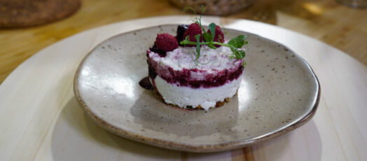 Sajttorta ordával és szedres-málnás öntettel