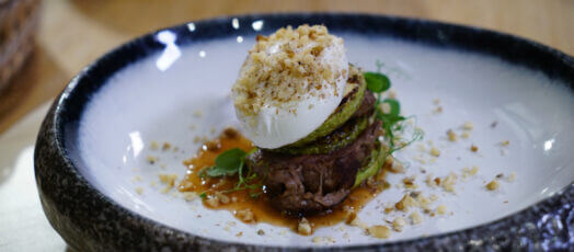 Bélszín cukkinivel, buggyantott tojással és dióval