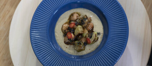 Serpenyőben sült kakas vaníliás-mandulás zellerkrémmel