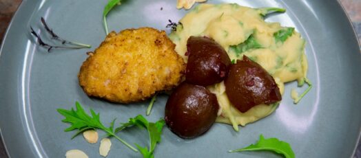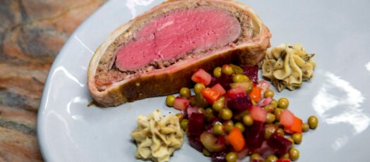 Wellington bélszín parmezános vargányagombás burgonyapürével, orosz vinaigrette salátával