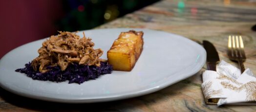 Pulled pork fűszeres szilvás barbeque mártással, kétszersült burgonyával, áfonyás vöröskáposztával