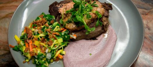 Bélszín steak, libamájjal, bacon morzsával, lilaburgonya pürével, és friss salátával