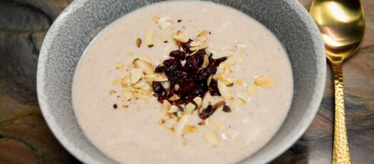 Gesztenyekrémleves, pirított mandulával, rumos aszalt áfonyával