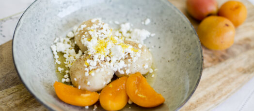 Sárgabarackos, túrós gombóc barnított vajjal (meruňkové knedlíky)
