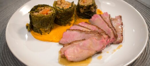 ROZÉ KACSA, RÉPÁS-TÖKÖS DIÓS CSILIVEL TÖLTÖTT KELLEVÉL, SÁRGARÉPÁS SÜTŐTÖKÖS PÜRÉVEL