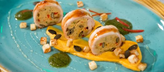 BACONBE TEKERT PULYKA VÖRÖSÁFONYÁS TÖLTELÉKKEL, KRUMPLIPÜRÉVEL