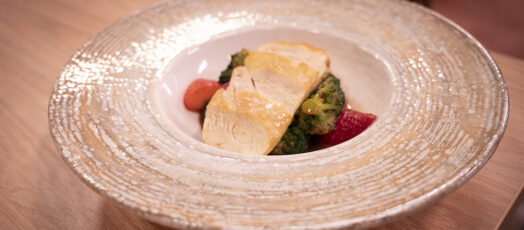 Csirkemell gyömbéres brokkolival, sült eperrel