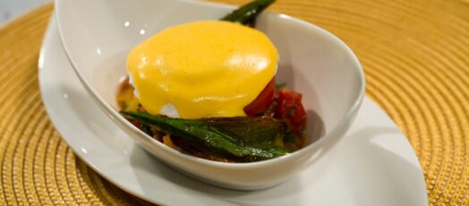 PARADICSOM SALÁTA BUGGYANTOTT TOJÁSSAL, HOLLANDI MÁRTÁSSAL ÉS SÜLT PARADICSOMMAL