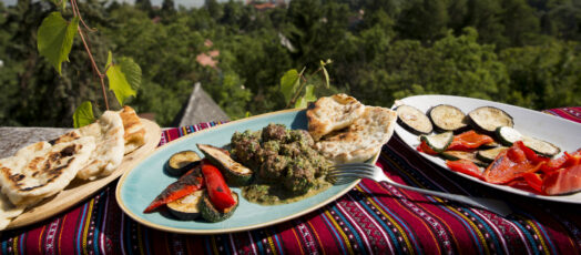 Zöld currys húsgombócok zöldséggel, naan kenyérrel