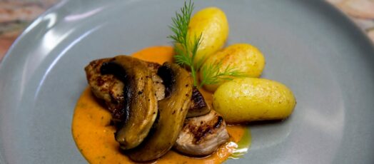 Borjúkaraj kapros, paprikás mártásban sült libamájjal, sült gombával