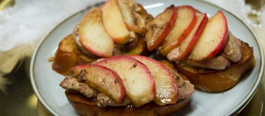 Roston sült libamáj fahéjas almával, narancsos aszús mártással, kalácson