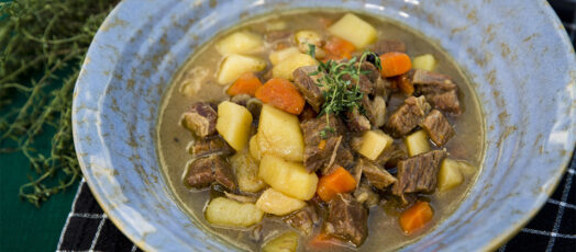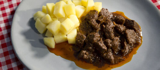 Szarvaspörkölt bográcsban főtt burgonyával és párolt paprikával